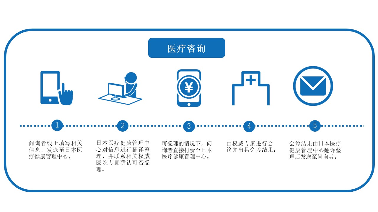 1)请如实填写以下事项后,点击【发送】 2)原则上,负责人会在接到患者咨询申请后24小时内尽快给出回复。(周六、周日和日本节假日除外) 3)确认汇款后,将在1~3个工作日内由负责人联络回复。(周六、周日和日本节假日除外。我们会尽量在短时间内给出回复,但是由于患者病情等不同,处理的时间也会有所不同,请谅解) *原则上,仅需要提供患者的准确的疾病名称即可;因病情而异,后期有可能需要追加提供其他医疗相关信息(如:诊断书,影像数据,血液检查报告等)。