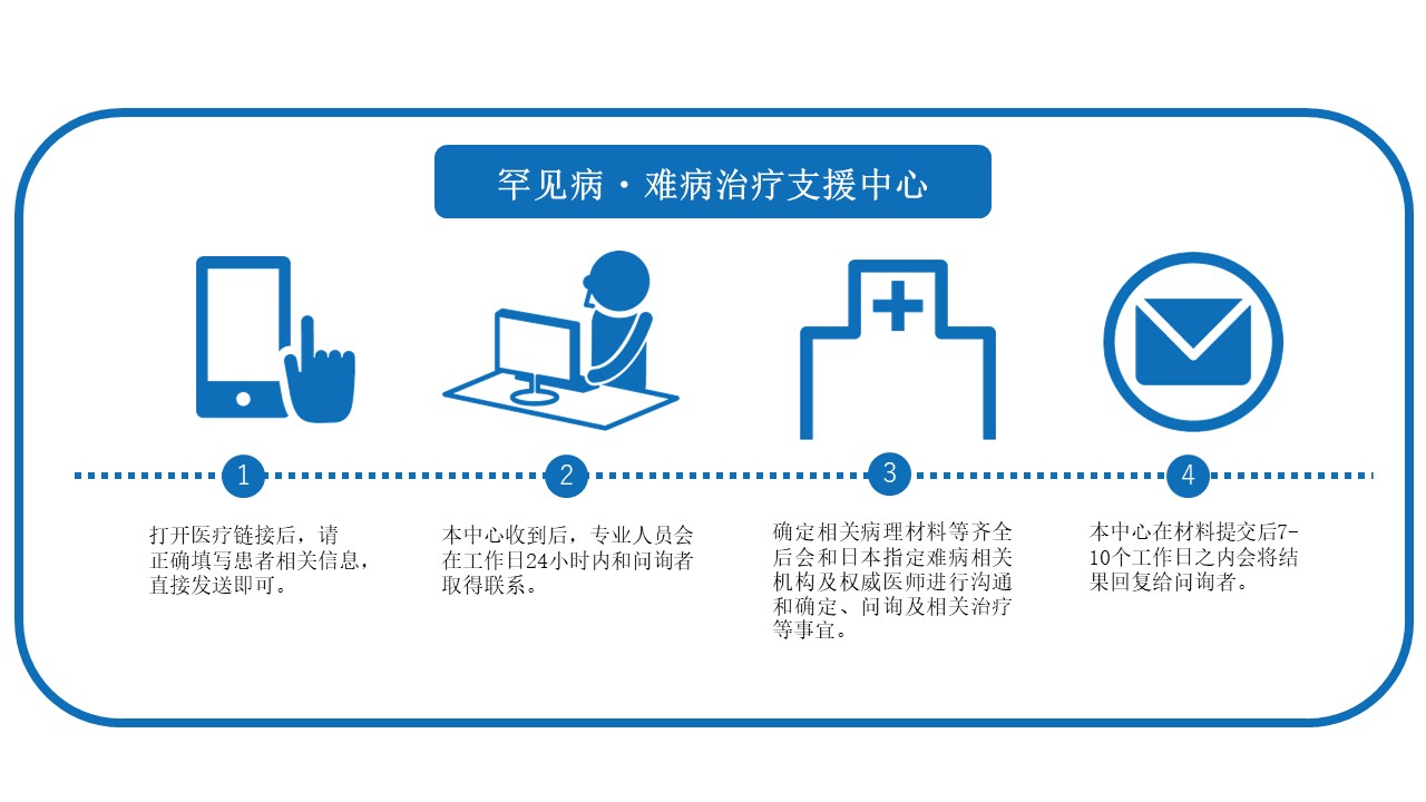 关于罕见病 · 难病的相关咨询 1.目前患者的疾病确诊结果是否需要再确定。 2.目前的治疗方式和方法是否还有更好的循症治疗和药物选择。 3.是否有来日本诊断、确诊、治疗的必要性及相关流程和费用。 4.提供有关相同疾病日本的治疗实绩及相关最新医疗资讯。
